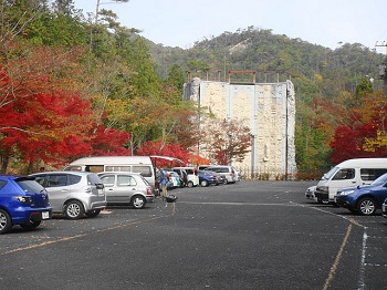 | 9:33 管理棟下の駐車場入口。カエデが鮮やかに染まってます。 |