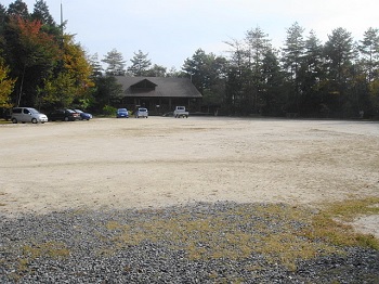13:34 駐車場到着。奥は休憩所。 |