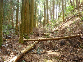 | 11:20 植林の中を進みます。至る所に倒木。頻繁には整備されていないようです。 |