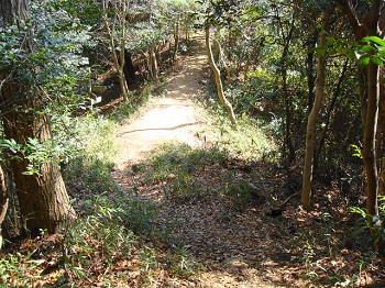 | 10:06 千畳敷、本丸跡。矢に使った竹の群生有り、弓矢の滑りを良くする為の椿も植えられています。 |