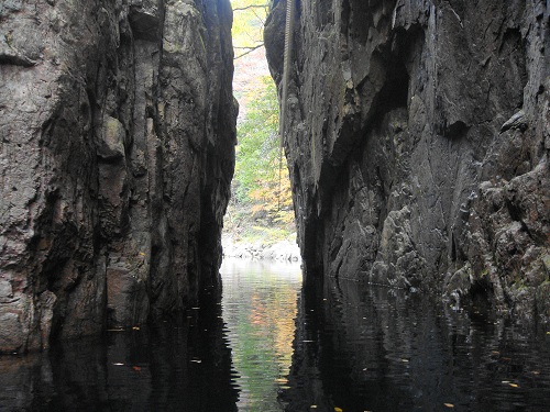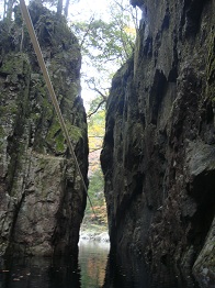 | 猿飛、奥に二段滝。切立った絶壁も凄いが、水深7mにも驚き!残念だが透明度は低い。舟で料金400円。 |