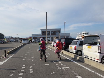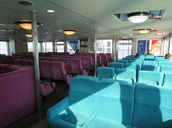 | 8:40分のフェリーに乗ろうと急いだが、ターミナルに着いたのは1分前。切符売り場のお姉さんの一言「切符は船内でも買えますから、とにかく急いで行ってみてください」・・・何とか間に合った。しかし、ザックを背負って走ったのは初めてだ。 |