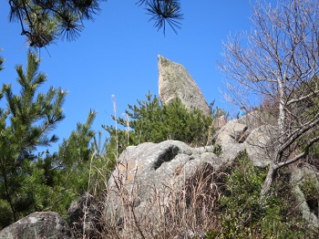 | 11:37 仰ぎ見るホタテ岩。空が眩しい。 |