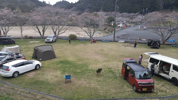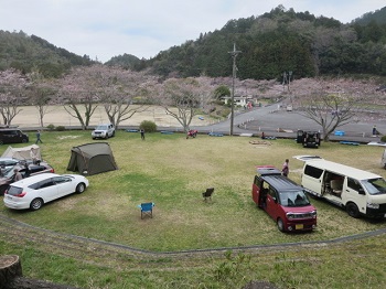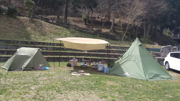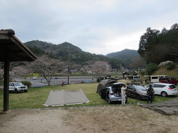 3人でキャンプ。泊まりは2人。桜が満開じゃなくて残念です。