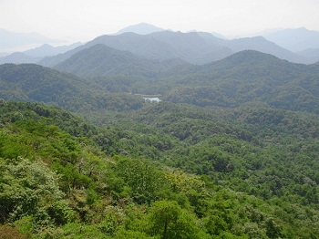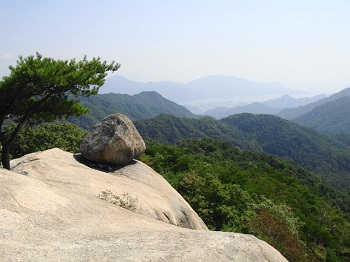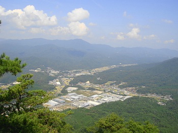 | 11:30 山頂奥の大岩から、佐伯町。遥かに大峰山。 |