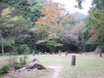 キャンプ場。きれいに清掃されています。小屋にグランドゴルフの用具有り。ほんのり紅葉の兆しかな。 |