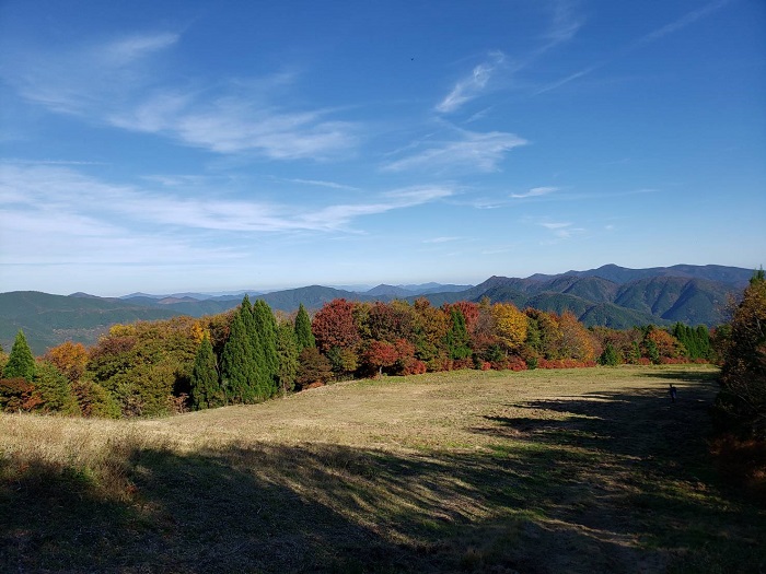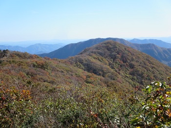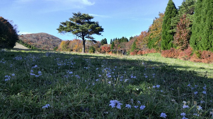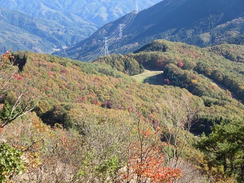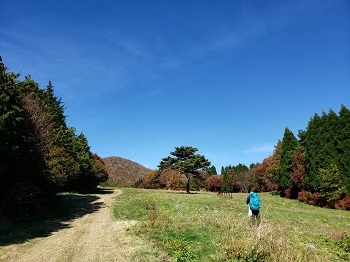| 紅葉を求めて鳥取県日南町の花見山へ。中国道新見ICで降りて国道180号を北上し、花見山スキー場へ。花見山ロッジは閉店。管理道の舗装道終点まで進む。下山してきたばかりの人々がマイクロバスに乗り込むのを待って奥に駐車。ゲレンデに入ってすぐマツムシソウの群落に出会う。 |