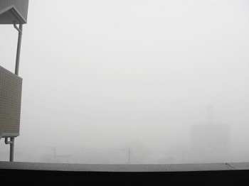 | 6:19 マンションの玄関から極楽寺山を見ると、濃霧で全く見えない。しかも小雨が降ってるし・・・。 |