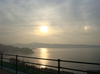 18:04 第二音戸大橋駐車場から見る夕陽。右は虹。 |