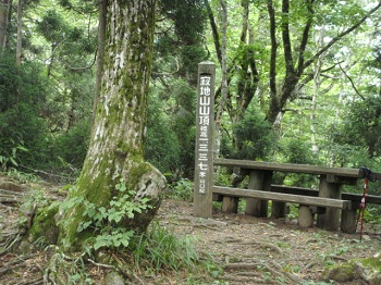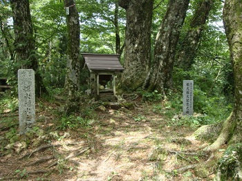 | 頂上の祠。第十八回国体炬火採火の地の石柱。 |