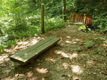 11:20 川の出合にある休憩所。ベンチが2つ。 |