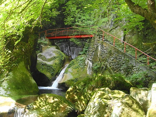 寂地峡入口の駐車場に車を停め、まずは五龍の滝を順に廻ります。龍頭の滝の上の木馬トンネルを抜けると、そこは・・・。