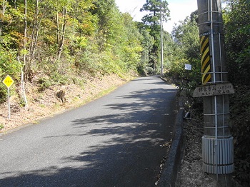 10:02 左のテープの所が登山口。電柱の標識も地味。 |