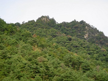 | 13:58 牛岩集落の林道から 歩いた稜線を仰ぎ見る。 |