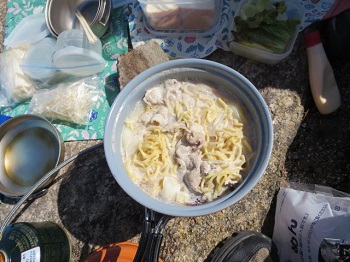 | 11:30 ホットサンド・・・風が強い。 | 14:48 駐車場へ。 | |