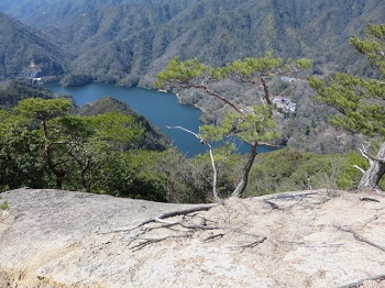 | 小瀬川ダムを見下ろす冠岳へ。ダムそばの南側駐車場に車を停めて、登山口へ。いきなりの急登にびっくり?山頂まで約60分の案内あり。しかし、今日は花粉症との戦いじゃあ。 | ||