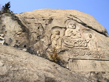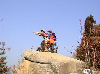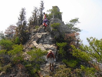 11:35 八畳岩からみた白滝山頂上。殆んどの人が鐘をついてるよ。 |