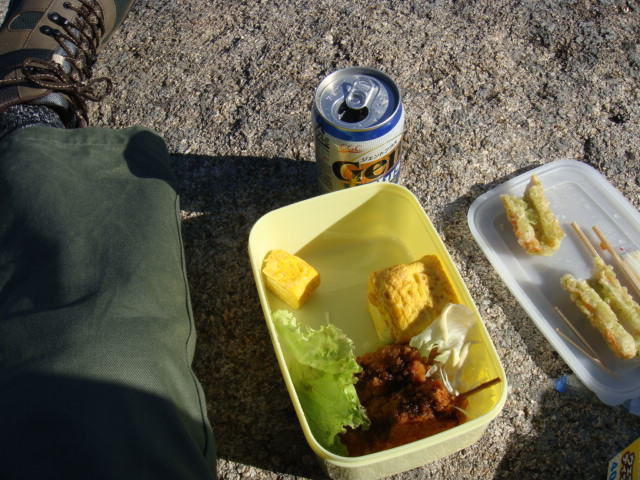 | 岩上でランチ。眺望良し、ビールも美味い。 |