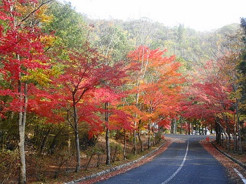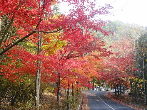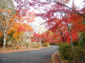 | 9:33 管理棟下の駐車場入口。カエデが鮮やかに染まってます。 |