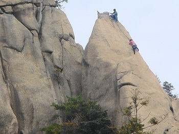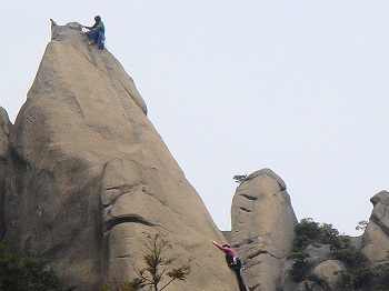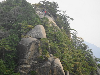 12:58 見晴岩の上から見上げると 中ノ岳山賊の岩壁を登る人影が・・・。 |