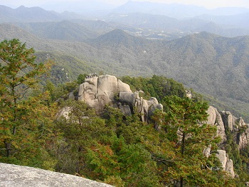| 11:22 夕陽岳先端の岩場から見上げる。 |
