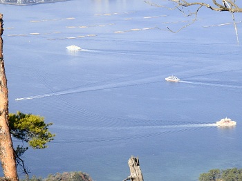 13:58 フェリーの軌跡、奥に牡蠣筏。 |