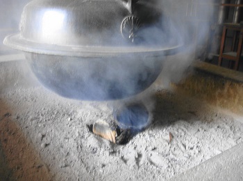 | 14:15 消えかかってる「消えずの火」。釜のお湯もぬるい。 |