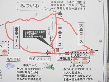 | 9:42 三石山登山口駐車場。 | 9:42 コース案内板。皇帝コースを登り、大原コースへ下る。 | |