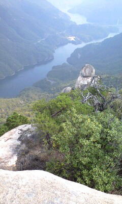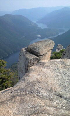 | 山頂は邪魔になるので、少し下がった所で。 | 雨乞岩から眼下に弥栄湖を望む。 | |