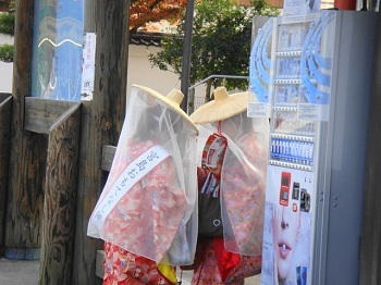 10:25 宝物館脇で、宮島おもてなし隊が・・・。夜目遠目傘の内とは言うが、顔が見えん。 |
