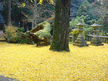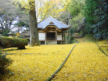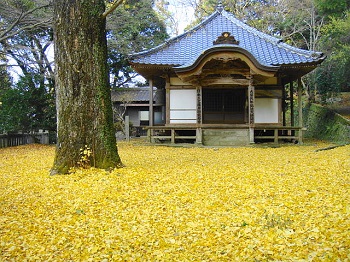 | 前日までは 十方山へ登ろうと思っていたが、急遽予定変更。周防大島へ出かけてみた。大島大橋を渡り 国道437号を三蒲バス停で右折。暫く山へ向かって走ると 文珠堂に着きました。境内は 黄金を敷き詰めたようだ。 |