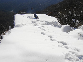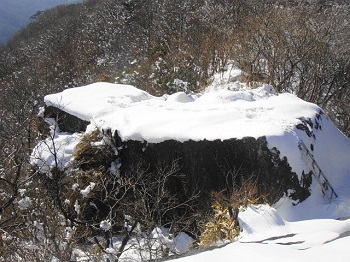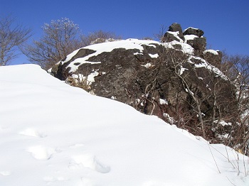 | 11:55 頂上直下の大岩。積雪30cm位、ここに寝たら 気持ちいいかな。 |