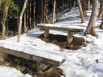 11:19 5合目下のベンチも雪化粧。足跡を見ると 2人先行してるようです。 |