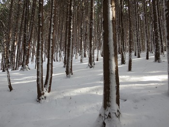 11:09 杉林。小動物が出てきそうな雰囲気。