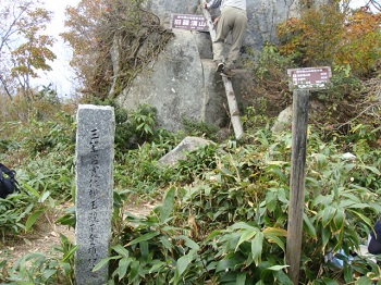 | 旧羅漢山頂の三笠宮寛仁親王登頂記念碑。大岩を降りるお尻が微笑ましい。 |