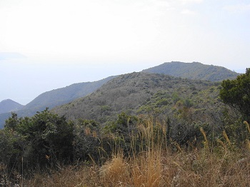 | 14:29 手前の山に白雲稲荷神社、奥の山に南の展望台がある。 |