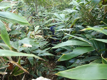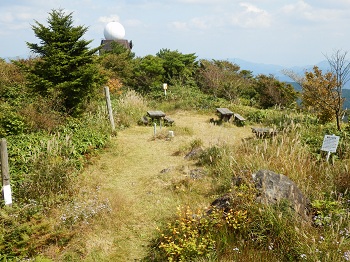 | 昨日に続き割とのんびりとした登山でした。ただ、雨量計ドームから男岩のコースを往復したが、笹が半端なく、頭から埃まみれになった。男岩から頂上に上る途中、→いこいの広場があったけど、ガイドブックに記載がなく、頂上まで登ってしまった。後悔することしきり・・・。 |