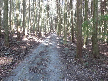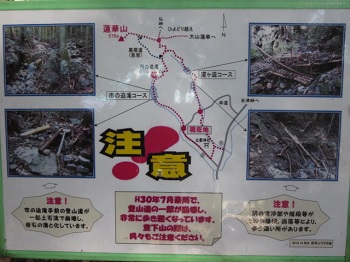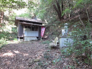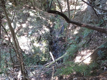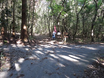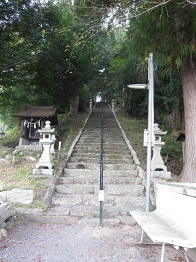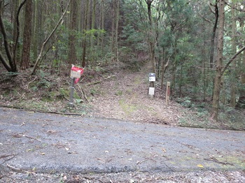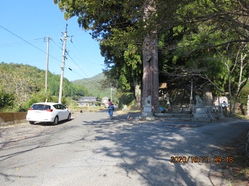| 比叡神社の長い石段下の路肩に駐車。2台程度のスペースしか無いが、平日なので他に車は無し。市の迫滝から廻って本コースへ下りる。 |