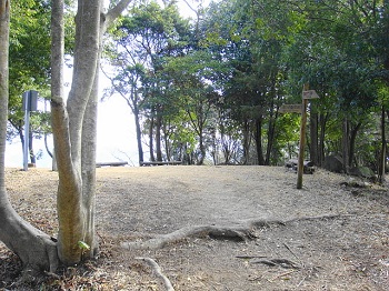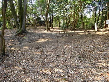 | 10:06 千畳敷、本丸跡。矢に使った竹の群生有り、弓矢の滑りを良くする為の椿も植えられています。 |