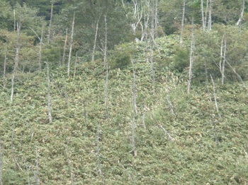 カラマツの白骨林。そういえば昔、ちょろ松、おそ松ってのもいたな。 |