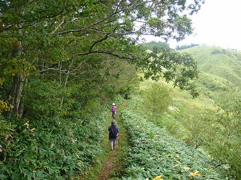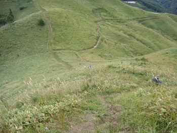 高山から急坂を降る。 |